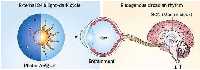 SCN retinadan gelen uyaranlar doğrultusunda sirkadiyen ritmi düzenlemekten sorumludur. 2000’li yılların başlarına kadar retinada yalnızca görmeyi sağlayan sistem tarafından kullanılan foto reseptörlerin (koniler ve çubuklar) de bulunduğu düşünülmekteydi. Ancak, yapılan araştırmalar çubuk ve koniler dışında retinada ışığa duyarlı başka reseptörlerin de keşfedilmesini sağladı. Işığa duyarlı gangliyon (ipRGC) hücreleri, melanopsin adı verilen bir foto pigment içerir ve mevcut ışık miktarının düzeyini ve özelliklerini SCN’ye bildirerek uyku uyanıklık döngüsünün ve hormonal düzenin devamlılığını sağlar.